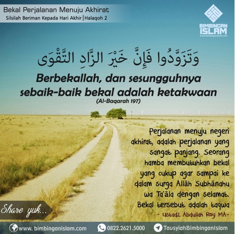 Perjalanan menuju negeri akhirat adalah perjalanan yang sangat panjang. Seorang hamba membutuhkan bekal yang cukup agar sampai ke dalam surga Allah سُبْحَانَهُ وَ تَعَالَى dengan selamat. Bekal tersebut adalah takwa kepada Allah ﷻ. Allah ﷻ berfirman :
