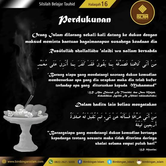 Saudaraku sekalian.. Ketahuilah, perdukunan dengan namanya yang bermacam² adalah perkara yang diharamkan dalam agama islam. Ilmu ghoib yang mereka akui pada hakikatnya adalah kabar dari jin yang mereka mintai bantuan. sedangkan, cara-cara tersebut hanyalah untuk menutupi kedoknya sebagai seorang yang meminta bantuan jin dan juga syaithan.