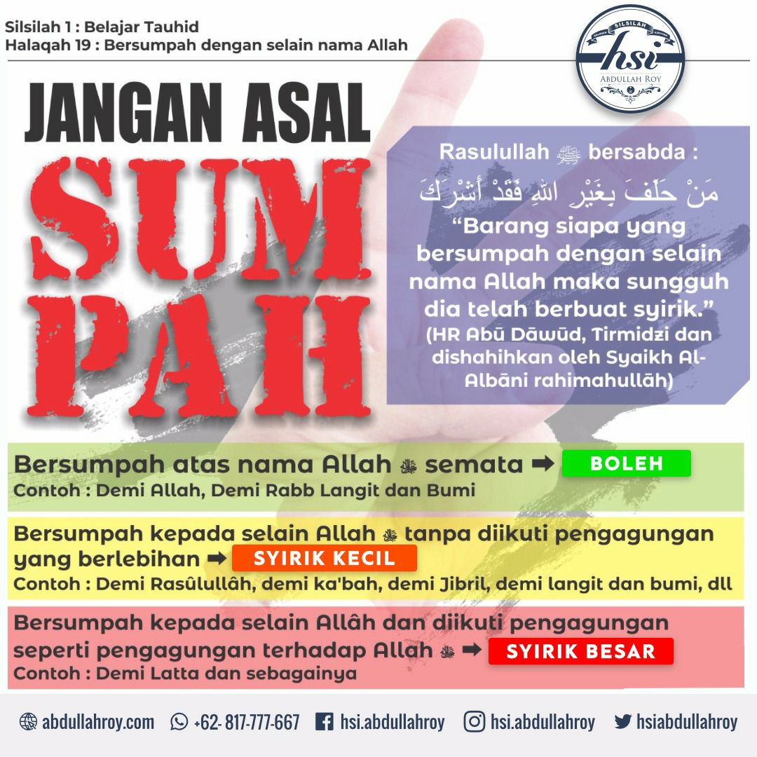 “Barang siapa yang bersumpah dengan selain nama Allāh maka sungguh dia telah berbuat syirik.” (HR Abū Dāwūd, Tirmidzī dan dishahihkan oleh Syaikh Al-Albānī raḥimahullāh)