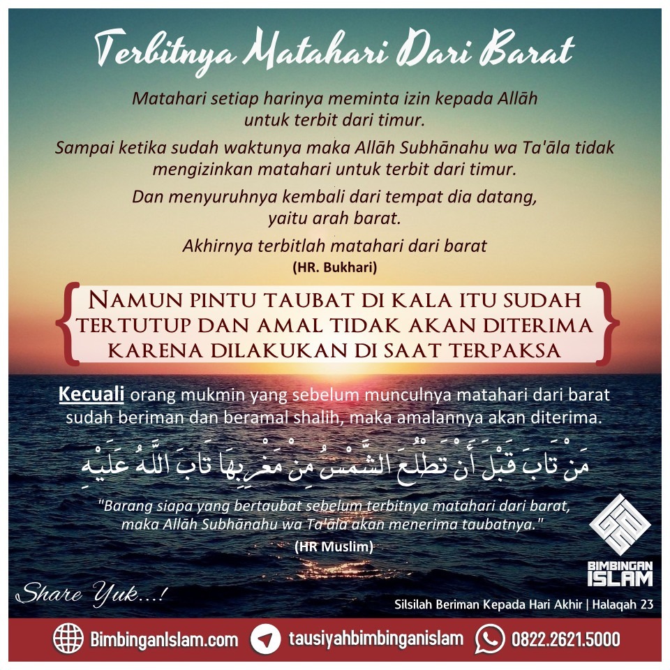 Barang siapa yang bertaubat sebelum terbitnya matahari dari barat, maka Allah سُبْحَانَهُ وَ تَعَالَى akan menerima taubatnya (HR. Muslim)