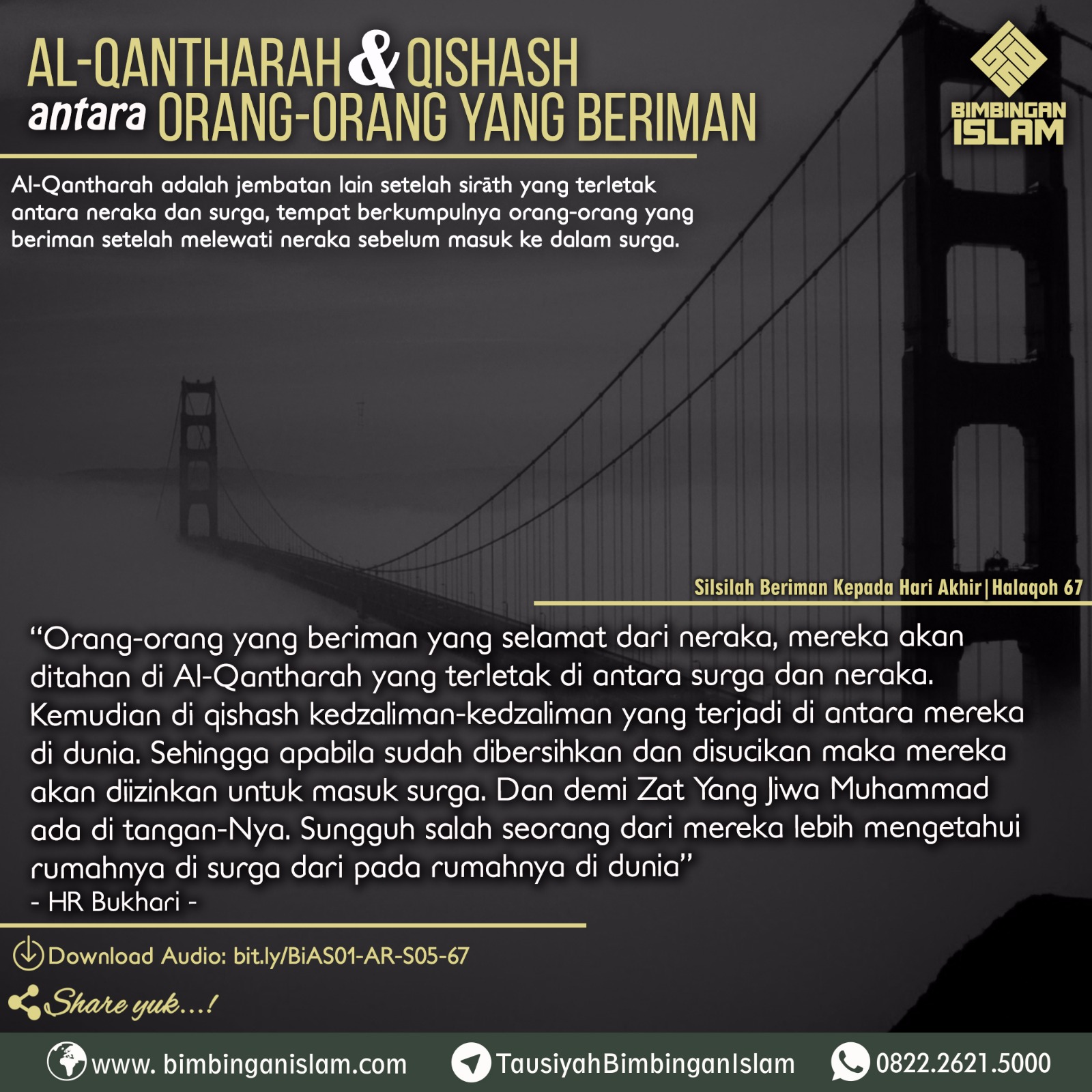 Halaqah yang ke- 62 dari Silsilah ‘Ilmiyah Berimān Kepada Hari Akhir adalah tentang “Al Qantharah Dan Qishāsh Diantara Orang-orang Yang Berimān”