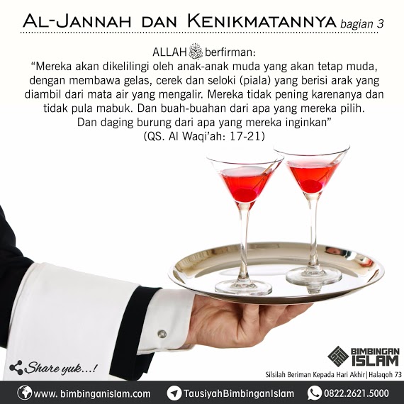 “Mereka akan dikelilingi oleh anak-anak muda yang tetap muda, dengan membawa gelas, cerek dan seloki atau piala yang berisi arak yang diambil dari mata air yang mengalir. Mereka tidak pening karenanya dan tidak pula mabuk. Dan buah-buahan dari apa yang mereka pilih. Dan daging burung dari apa yang mereka inginkan.