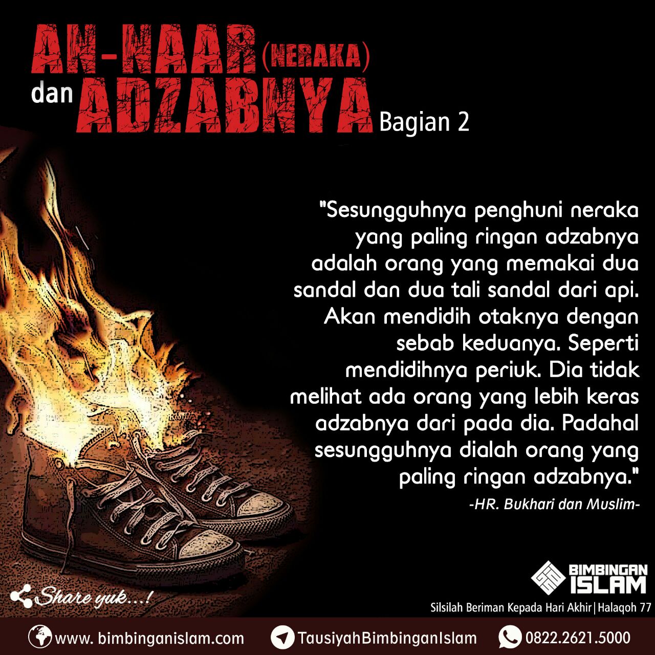 “Sesungguhnya penghuni neraka yang paling ringan adzabnya adalah orang yang memakai dua sandal dan dua tali sandal dari api, Akan mendidih otaknya oleh sebab keduanya. Seperti mendidihnya periuk, Dia tidak melihat ada orang yang lebih keras adzabnya dari pada dia, Padahal sesungguhnya dialah orang yang paling ringan adzabnya”